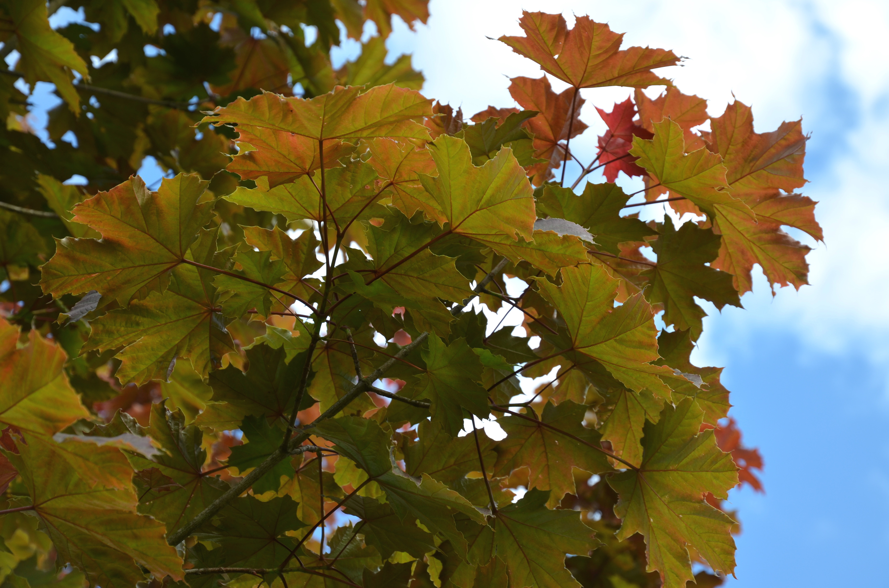 Laub: großes Ahornblatt, im Austrieb dunkelrot, später im Sommer wechselt die Farbe zu dunkelgrünrot; Herbstfärbung orangegelb.