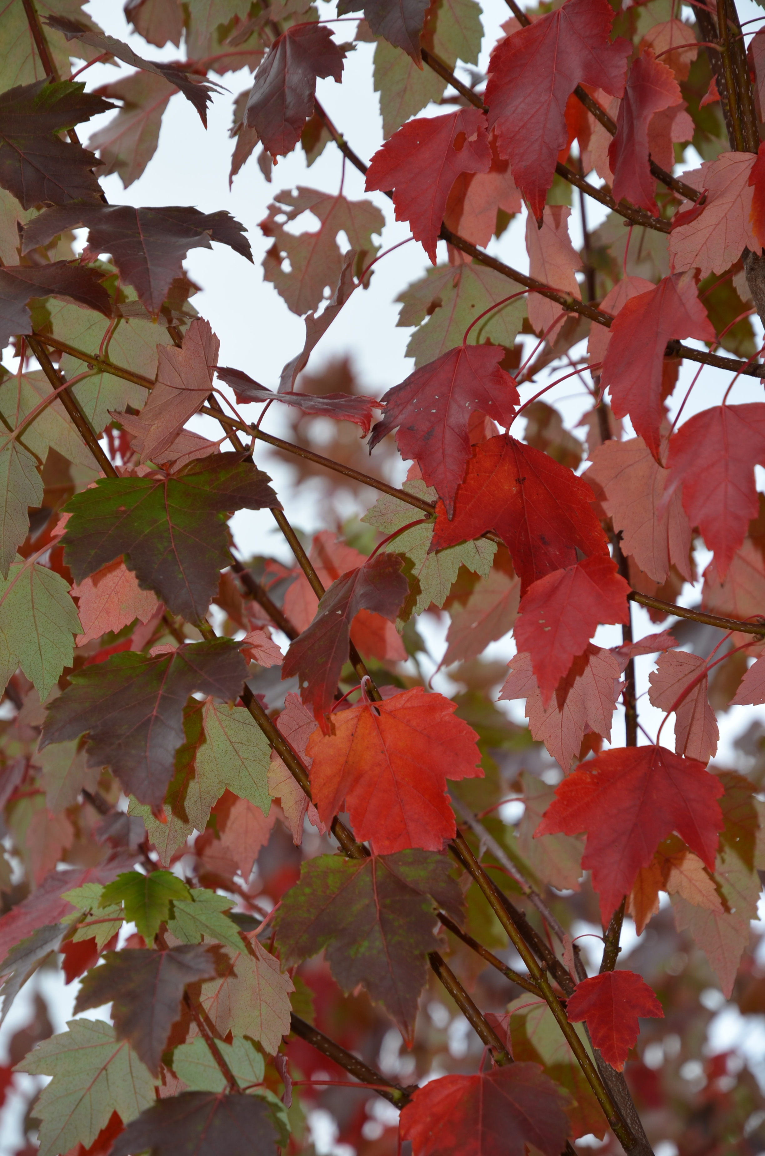 Laub: kleines, grünes Ahornblatt; Herbstfarbe leuchtend rot.