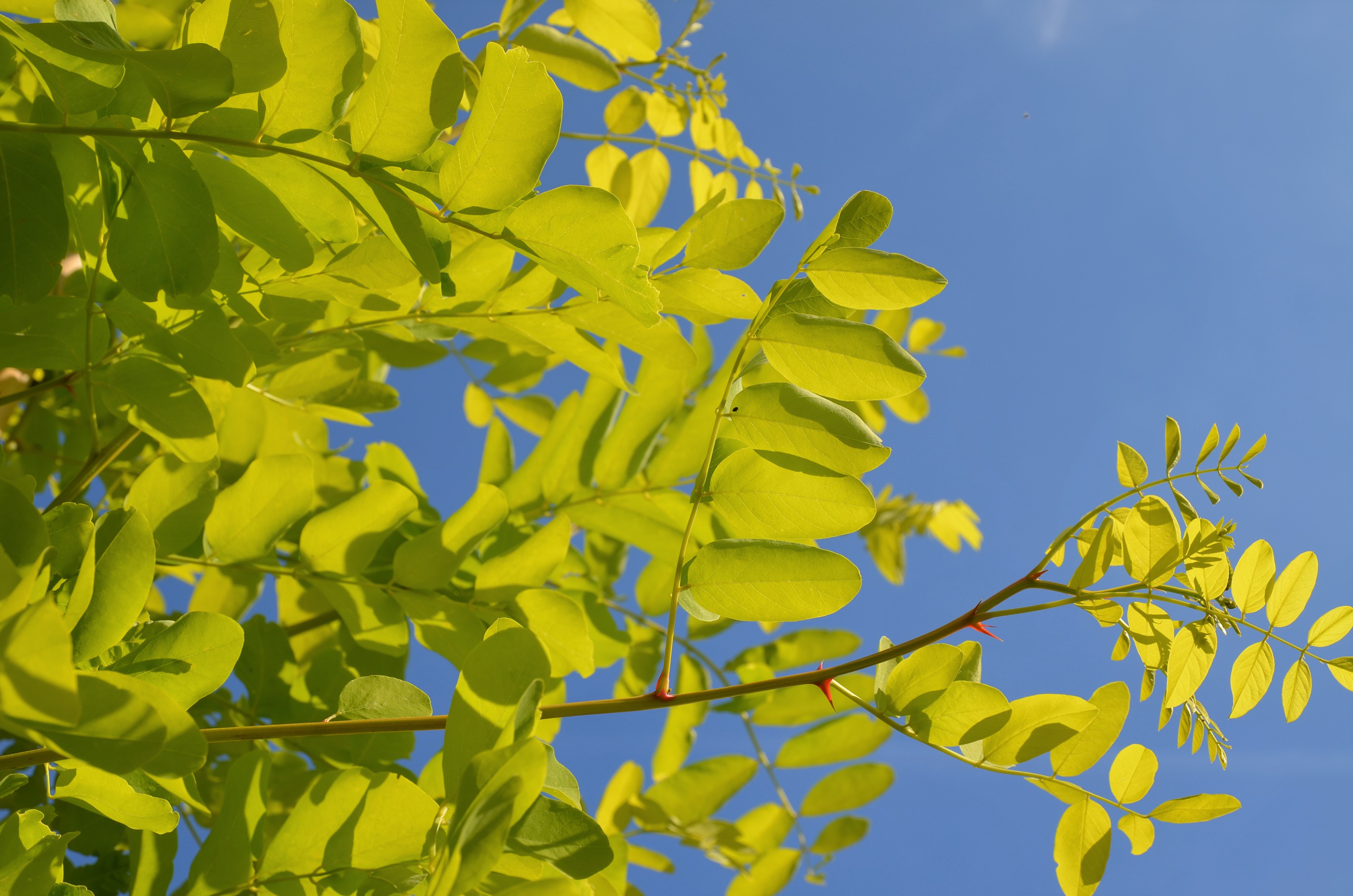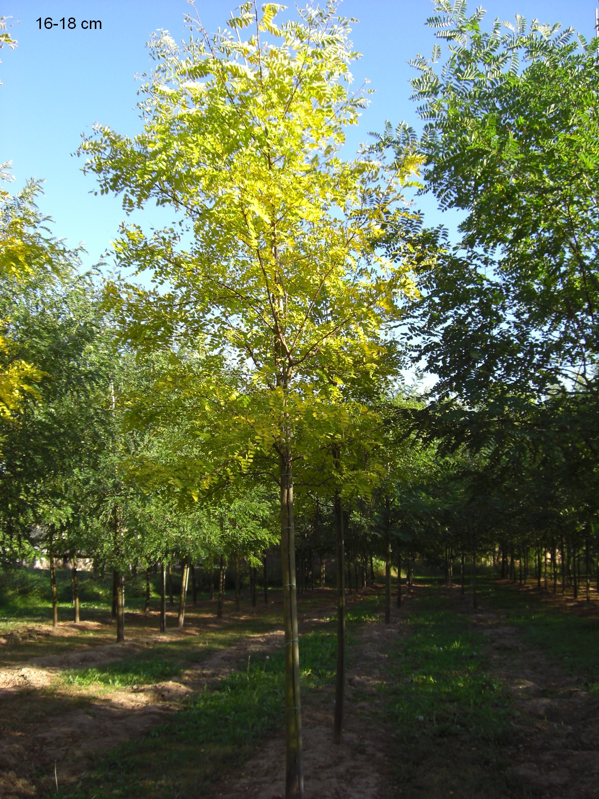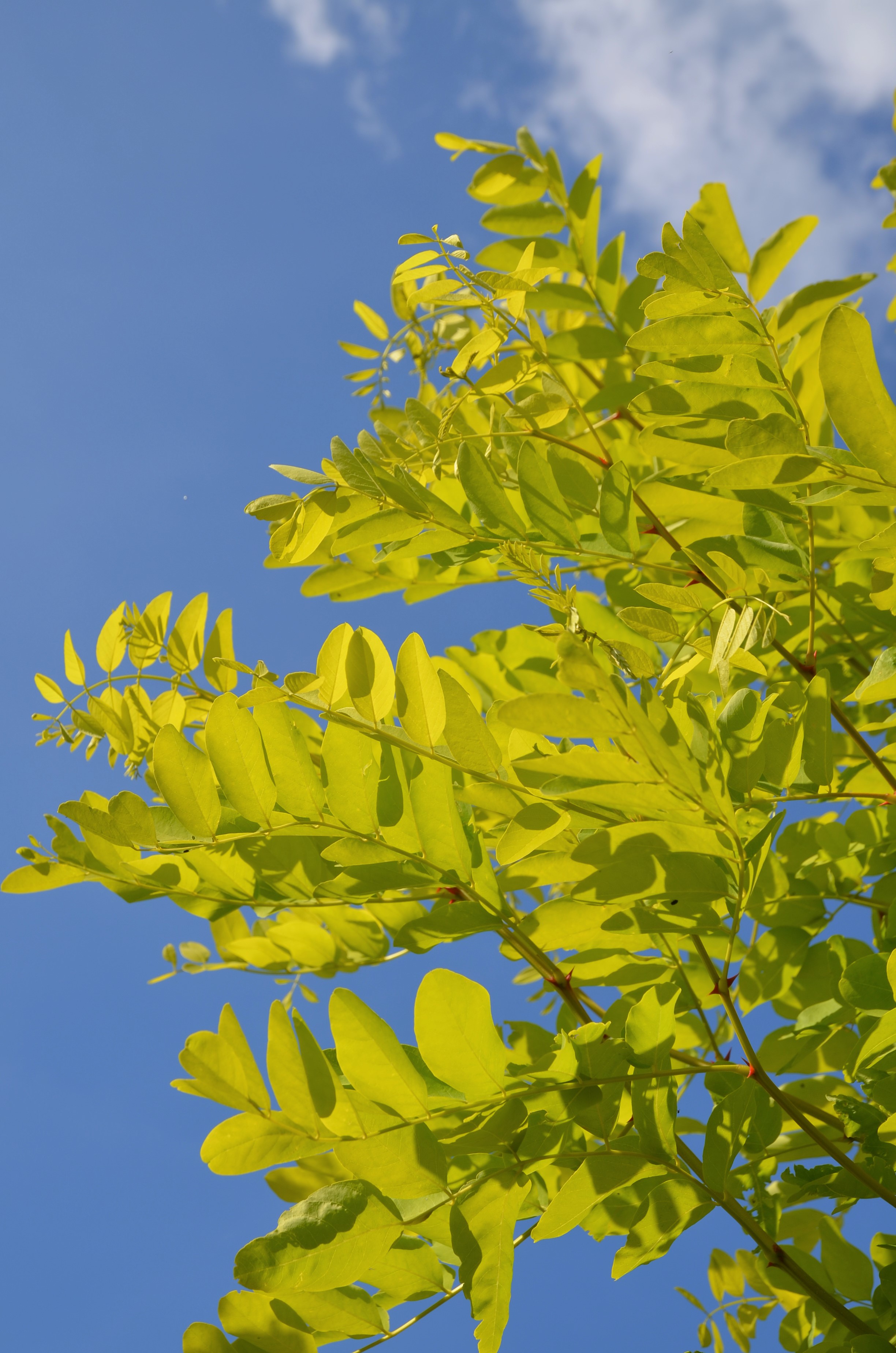 Laub: großes, gefiedertes Blatt, goldgelb im Austrieb, später gelb bis leicht vergrünend im Sommer, beruhigender Farbkontrast.
