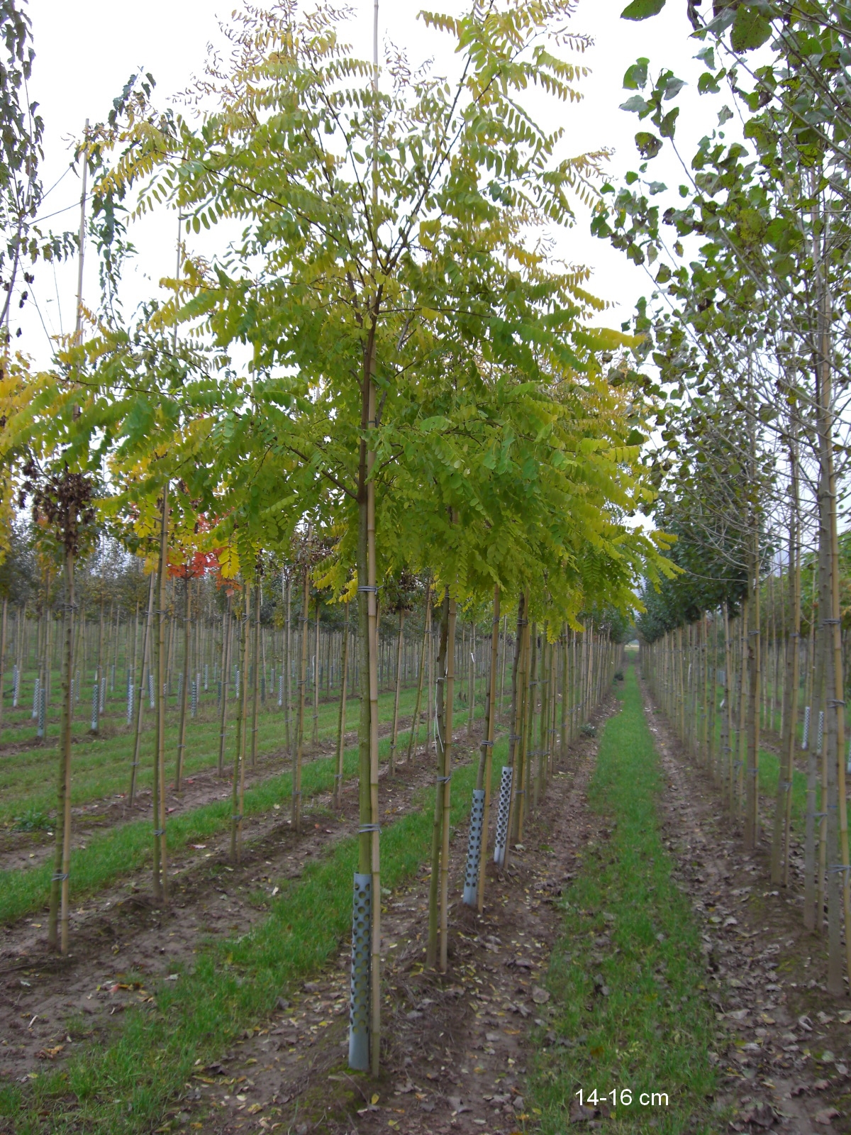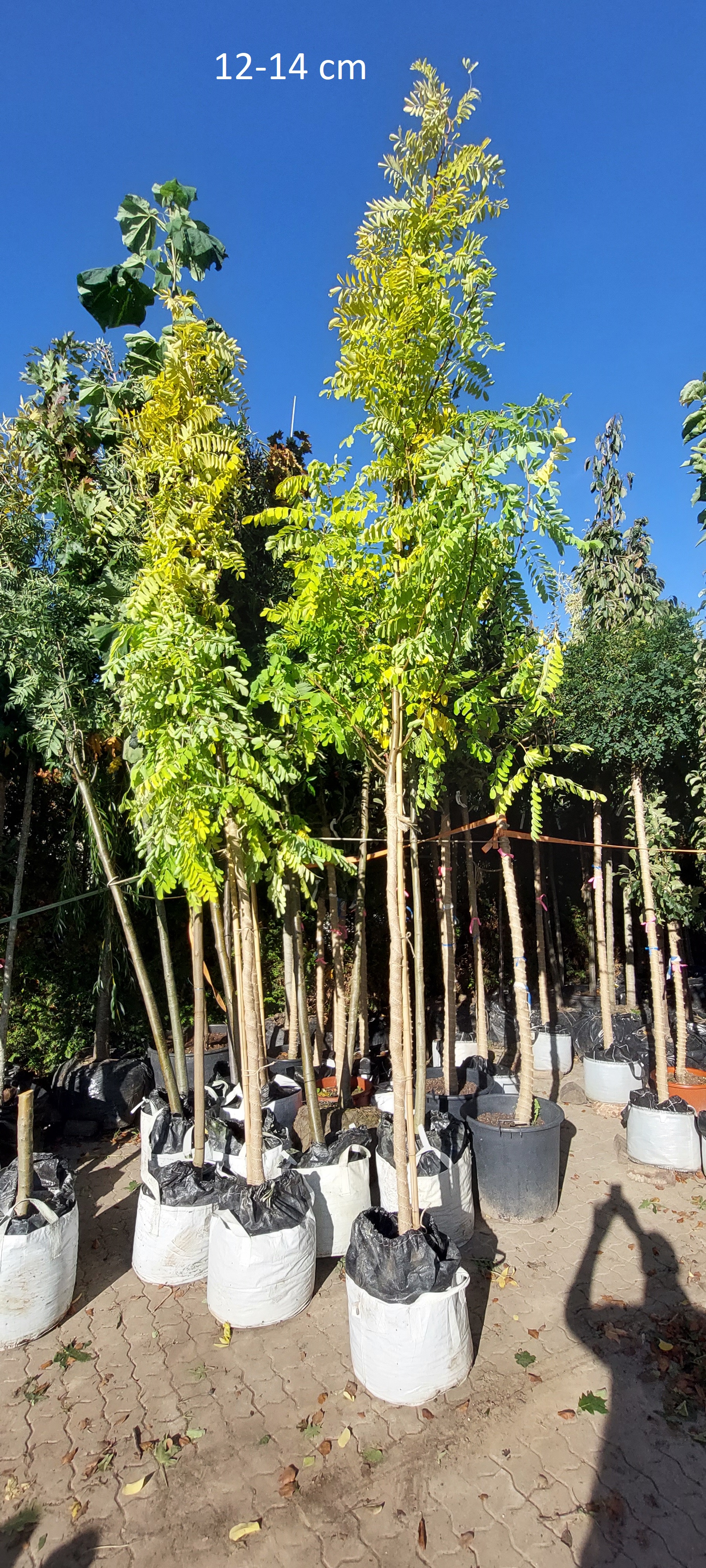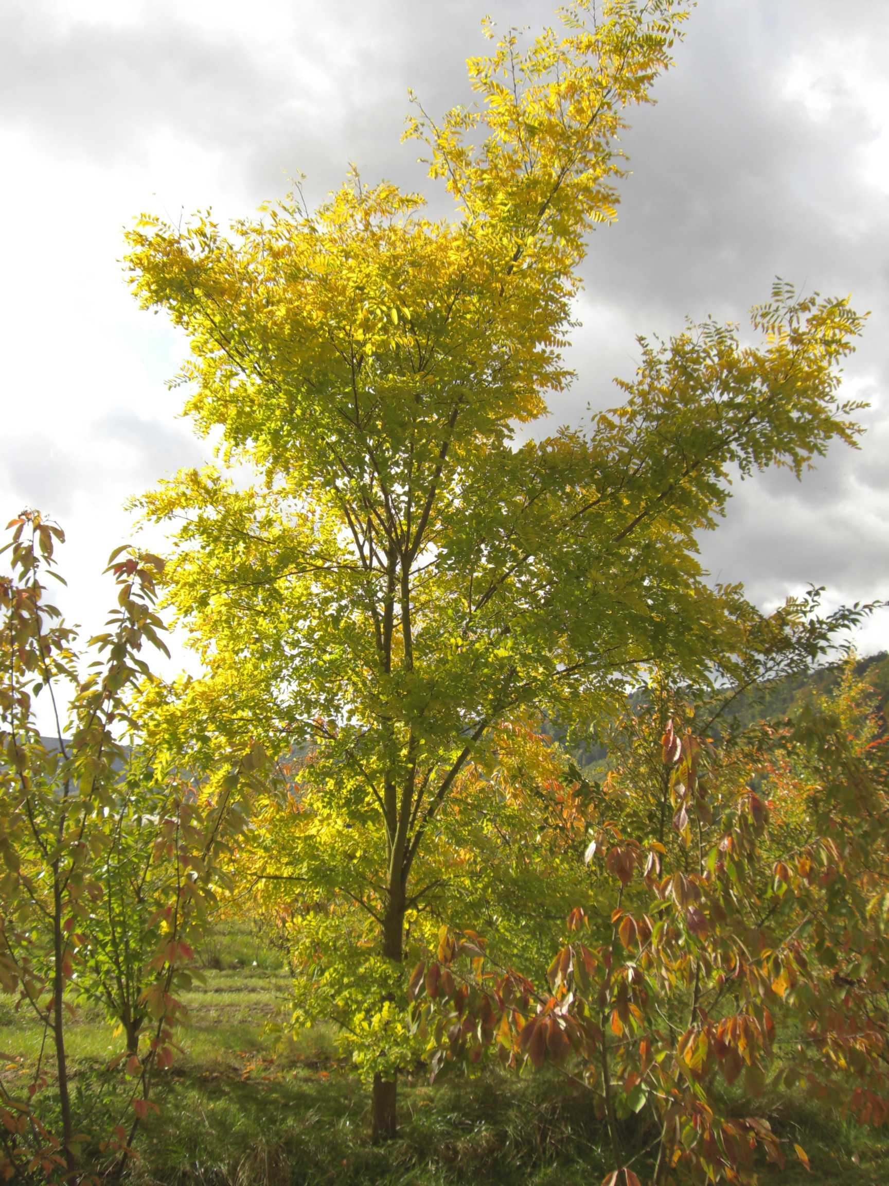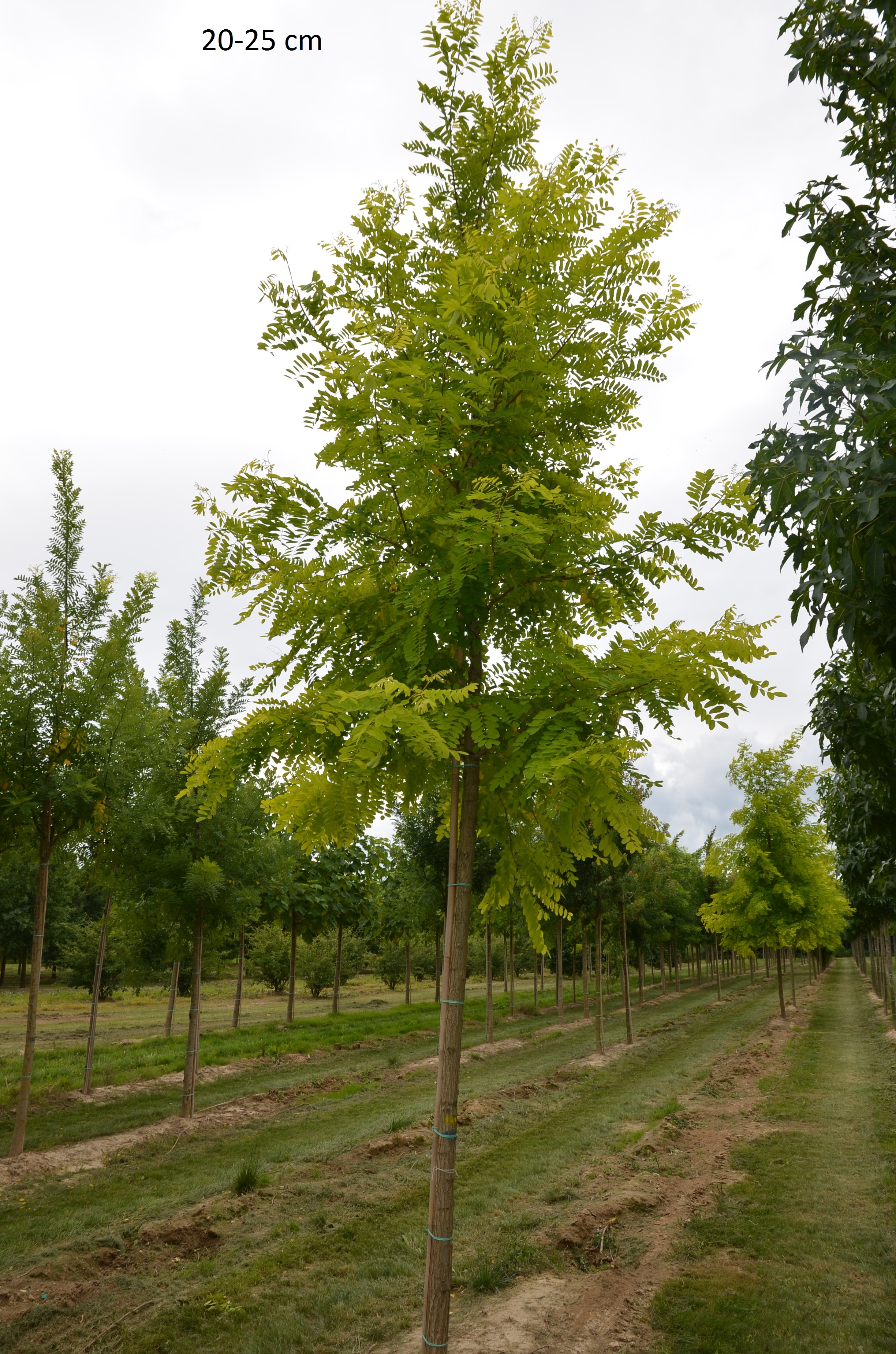 Laub: großes, gefiedertes Blatt, goldgelb im Austrieb, später gelb bis leicht vergrünend im Sommer, beruhigender Farbkontrast.