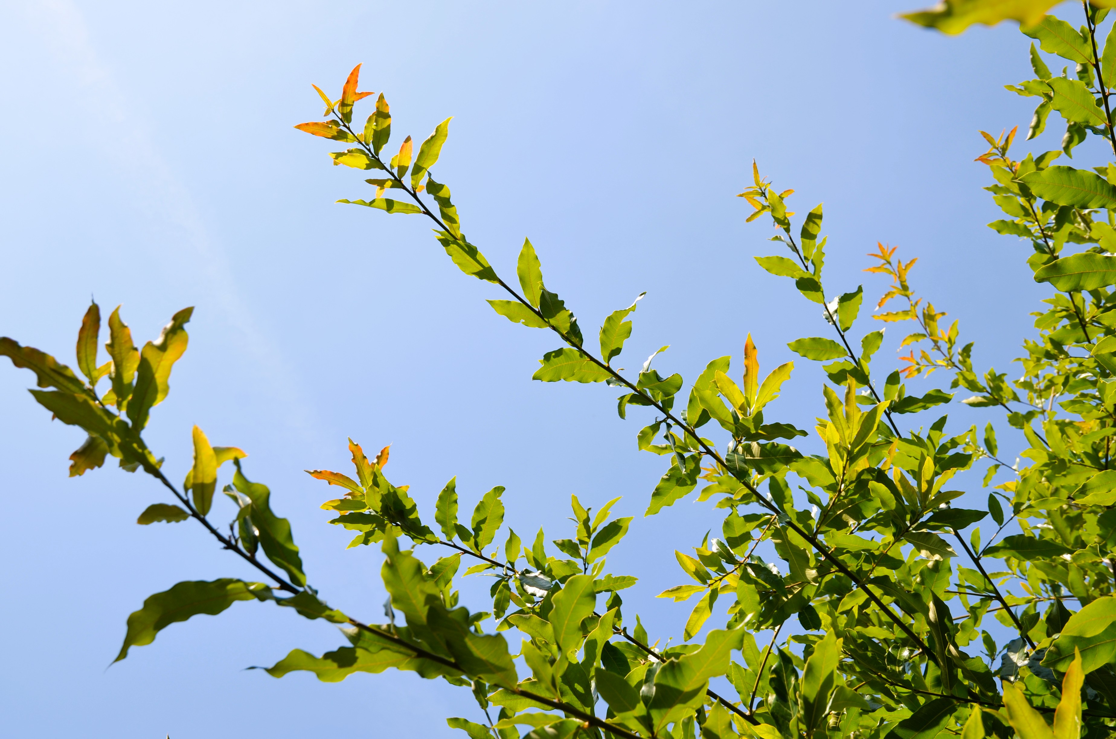 Laub: sommergrün; schmal-elliptische, ganzrandige Blätter, dunkelgrün und glänzend, 10–15 cm lang; Herbstfärbung anfangs gelb bis rotbraun, später braun.