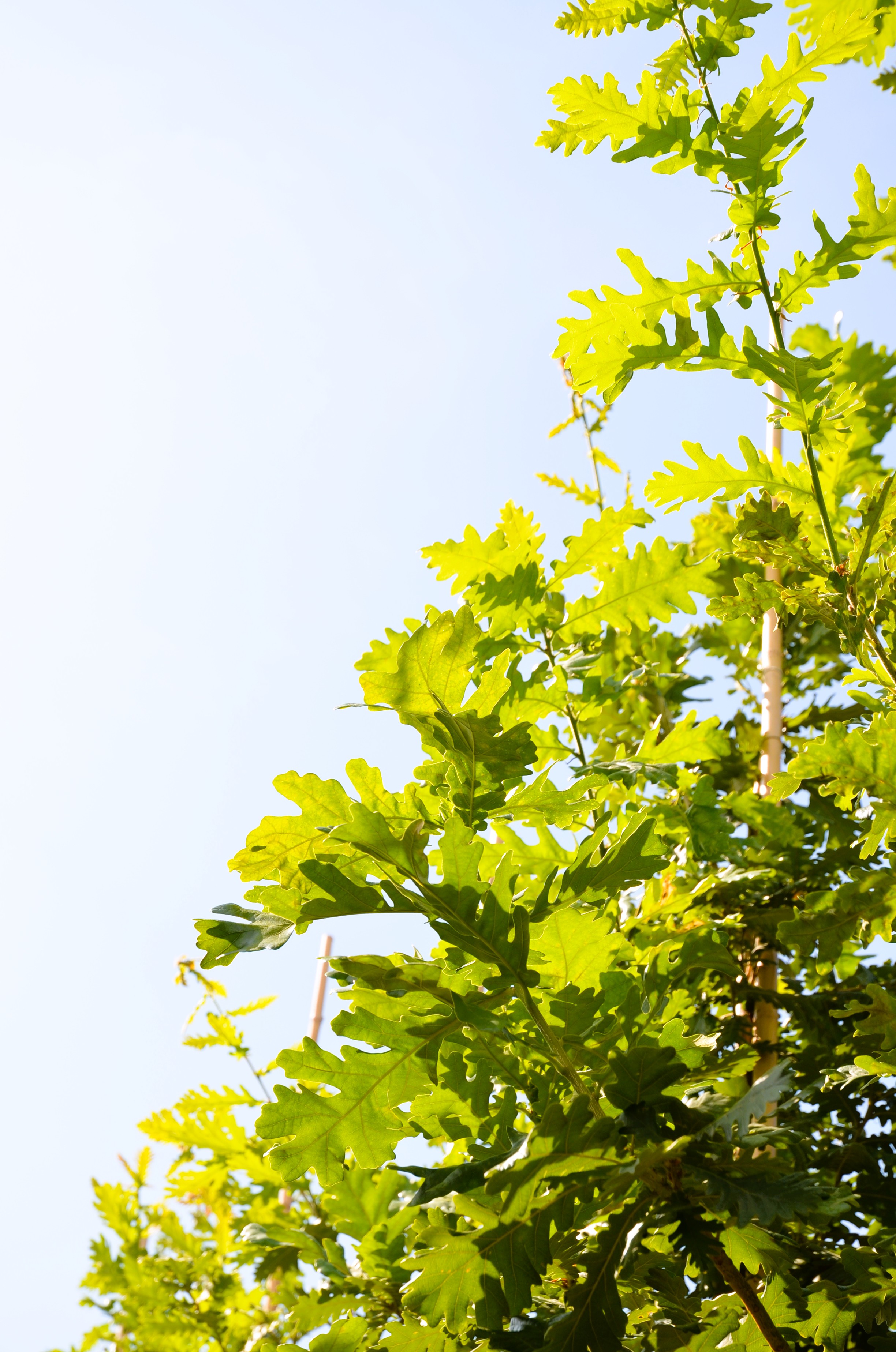 Laub: schönes, dunkelgrünes, gebuchtetes Blatt, das lange am Zweig im Herbst verbleibt und sich gelbbraun verfärbt.