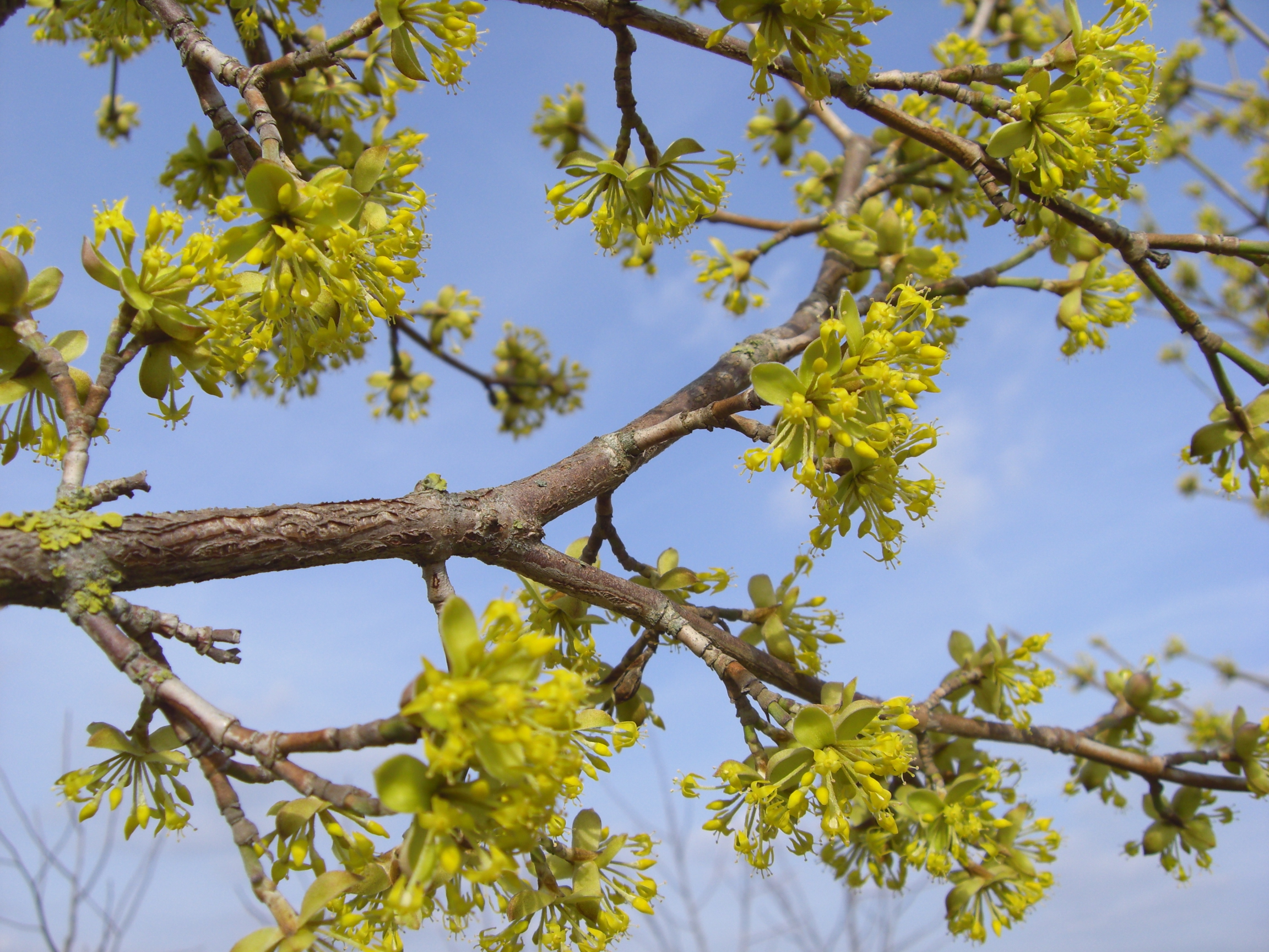 Blüte: vor dem Laubaustrieb erscheinen im März, in nicht kalten Wintern schon im Februar, gelb in kleinen Büscheln; selbstbestäubende Blüten; die Gattung stellt ein wichtiges Vogelnährgehölz dar.
