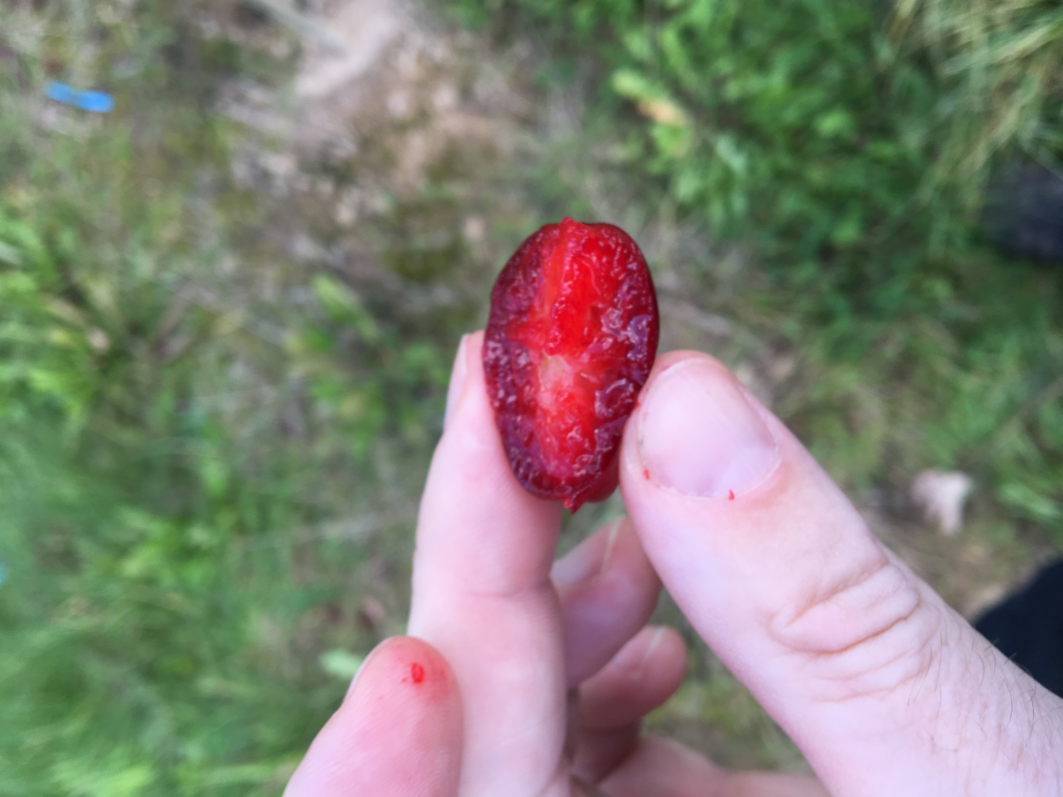 Frucht: großfruchtige Veredelung; Frucht dunkelrot, länglich, reichlich schon in jungen Lebensjahren; Geschmack überragend! Bei Vollreife wie köstliches Gelee, süßlich, cremig, decent säuerlich - super Naschfrucht und für Marmelade.