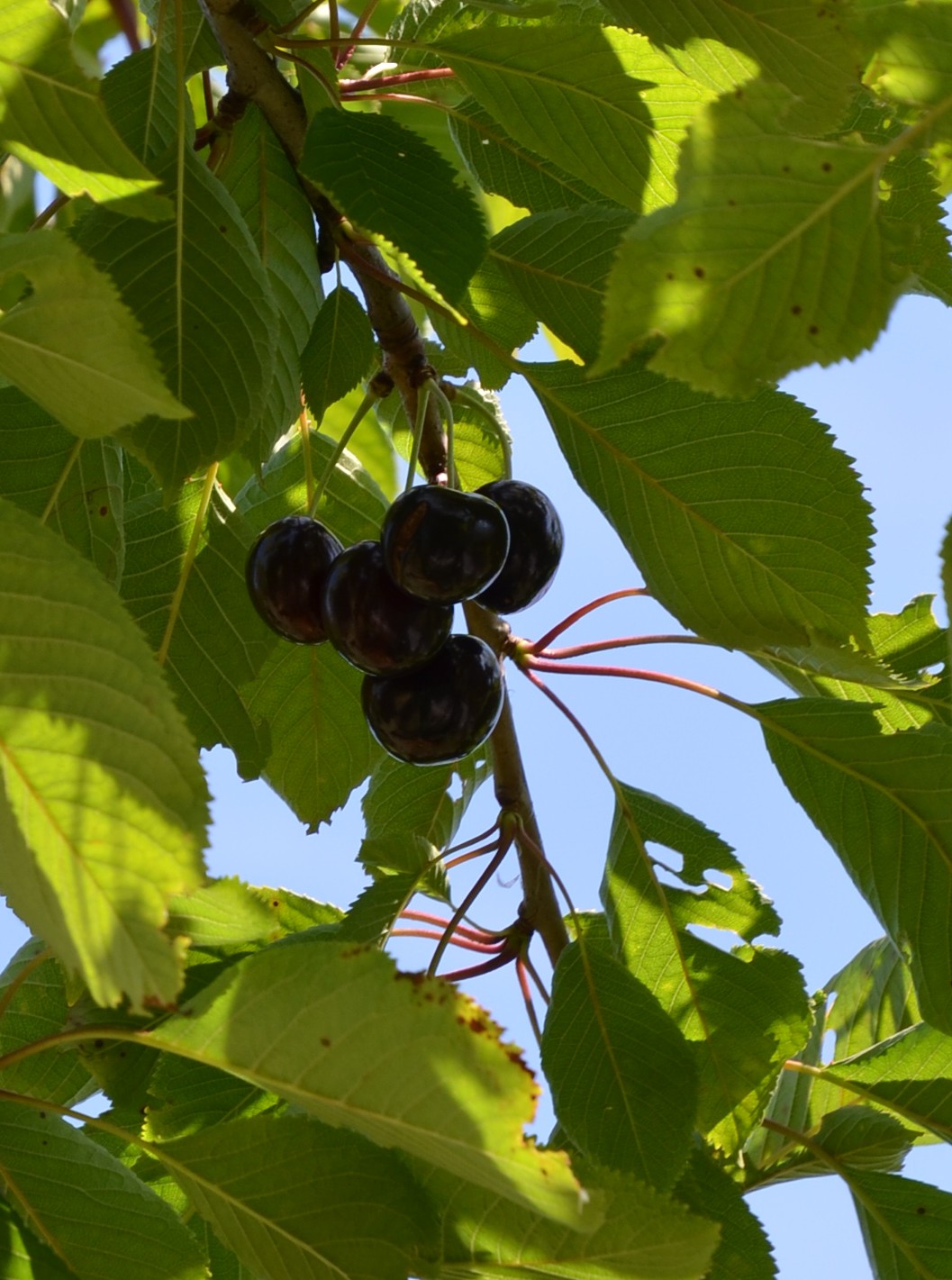 Frucht: mittelgroß; Haut dunkelrot bis schwarzrot.