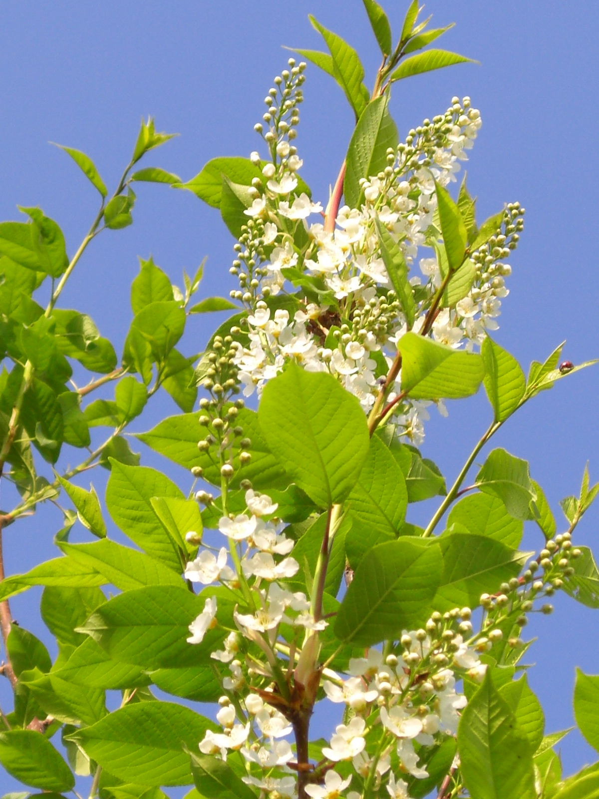 Blüte: lange, weiße Traubenblüten im Mai.