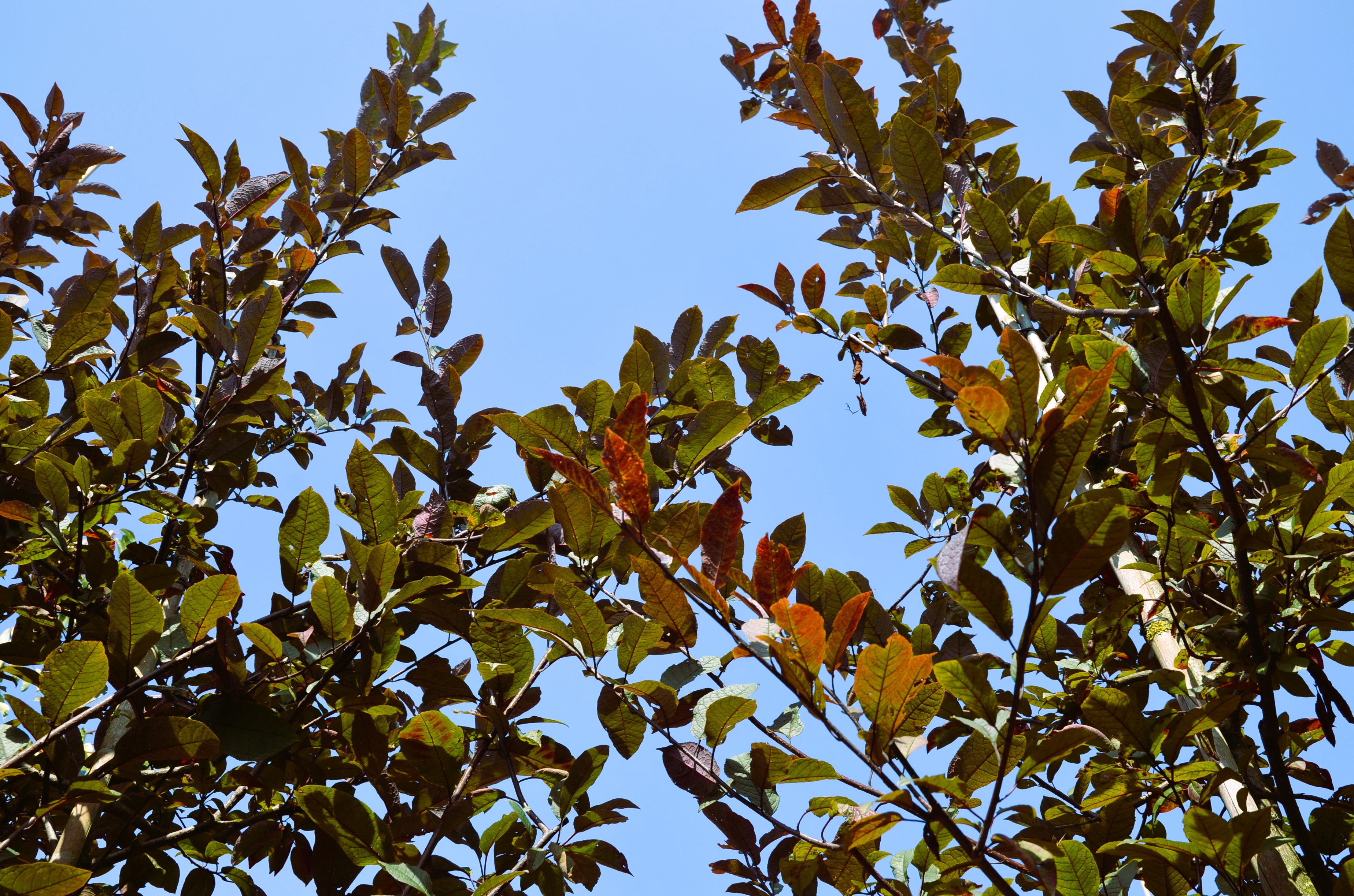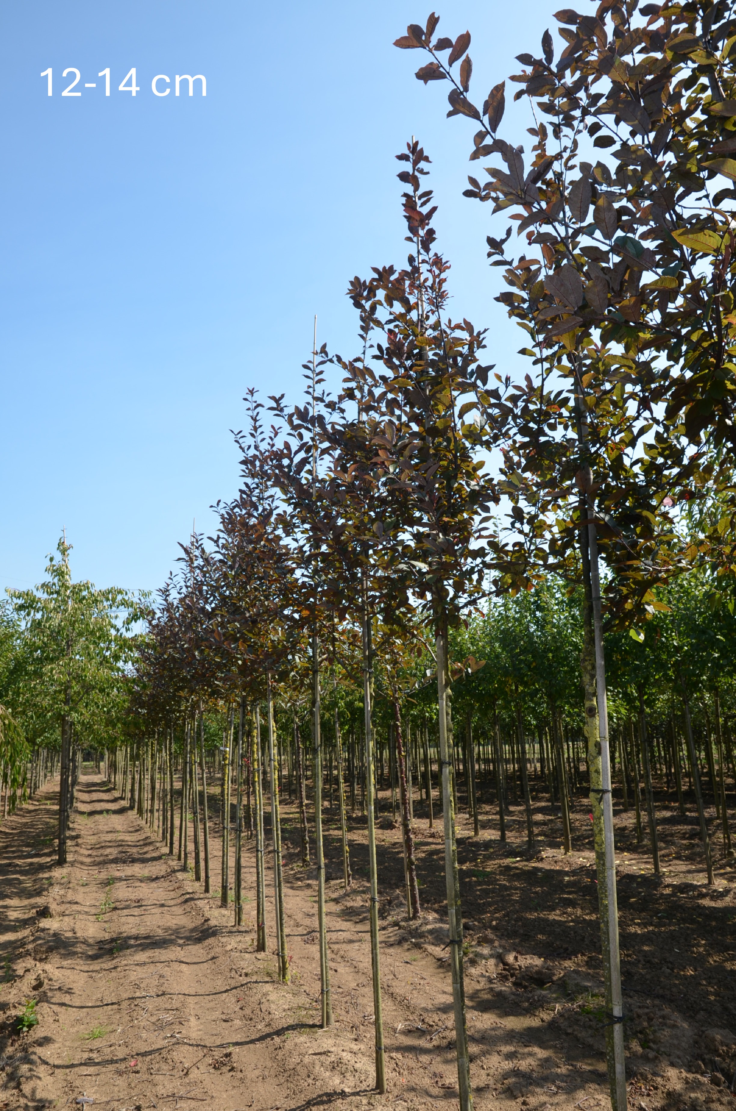 Laub: längliches, mittelgroßes Blatt; Blattunterseite purpurrot, Blattoberseite dunkelgrün; der kupferrote Frühjahrsaustrieb setzt zeitig ein.