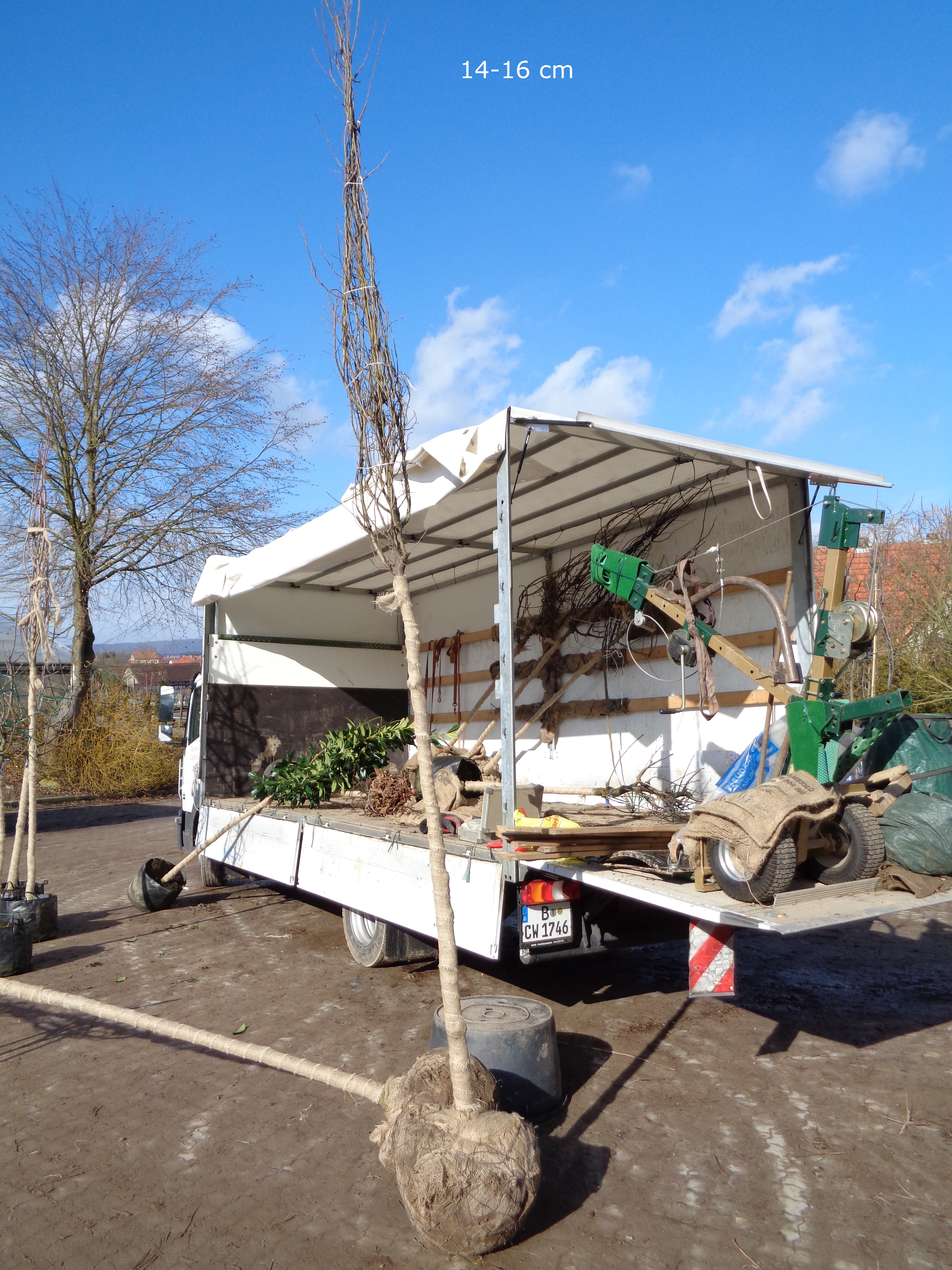 - Die Bäume wachsen im Freiland und werden mit Ballen aus dem Boden gestochen, danach, damit der schwere Erdballen an den Wurzeln verbleibt und zum Transport, mit einem Drahtkorb versehen.